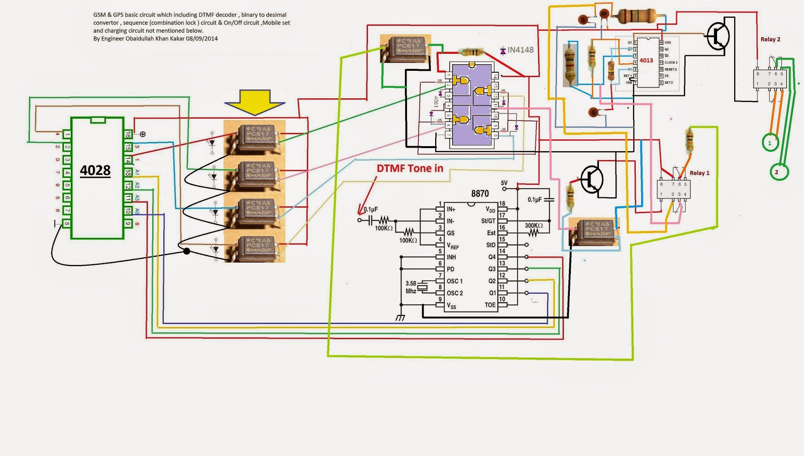 In this project a phone set required having built-in GPS module where you can get location coordinates and GSM location through sms from your vehicle,There will be call originated from car while someone try to open car door. You can get alert from car while someone try to open car door For call originating from car will required speed dial option in mobile phone set. First enable speed dial option, save your number with specific digit , solder the desire button, now both wires from the will be interface with car doors switch, It means that if someone open the door switch will be operated resulting to dial the specific speed dial number. Basic concept in circuit is that despite of different cellular mobile phone number in the tracking car should pass a combination (sequence) lock key, for this a simple 4081 AND gate IC were used where 4 keys required in a desire sequence, these 4 inputs were taken from 4028 (4 bit binary to decimal converter) IC to 4081, which is directly connected to 8870 DTMF IC outputs, in the last a simple touch on/off circuit were used from IC 4013.Interface between ICs 4028 & 4081 were done with the opt coupler PC817, Once sequence completed in IC4081, reset will required it is then done while using relay 2 along PC817.